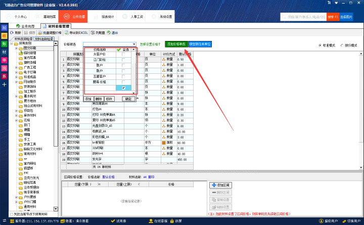 飛揚(yáng)動(dòng)力廣告公司管理軟件可以管理每一個(gè)客戶,可以根據(jù)客戶的合作關(guān)系,單獨(dú)綁定一套屬于客戶自己的價(jià)格報(bào)價(jià)。這樣,公司的管理者在給客戶開(kāi)制作單的時(shí)候會(huì)自動(dòng)顯示屬于客戶自己的價(jià)格,避免不同客戶不同報(bào)價(jià)的尷尬場(chǎng)面。