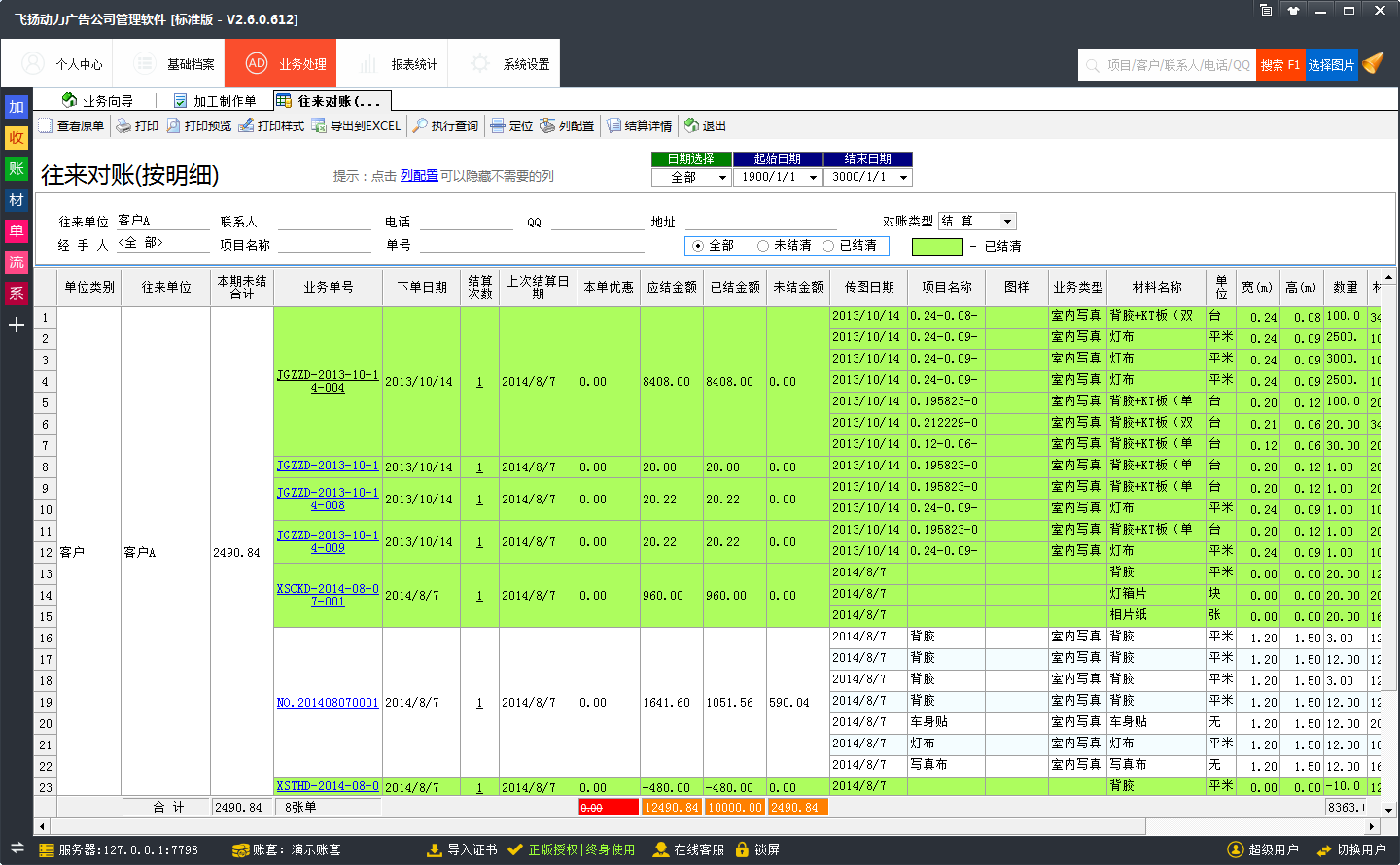 飛揚動力廣告公司管理軟件在對賬的時候,可以將所制作的圖片信息直接導出,或是直接打印出來。這樣,就方便跟客戶進行對賬。在進行對賬的時候,也可以篩選已結清,或是為結清的客戶進行單獨的對賬
