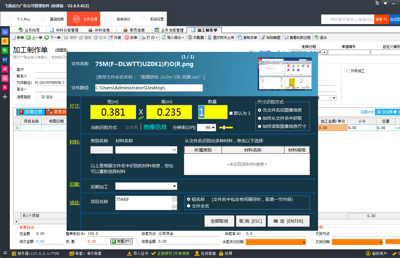 在飛揚(yáng)動力噴繪管理軟件中,只需要把圖片直接拖入軟件,軟件就會自動識別圖片的尺寸大小,圖片名稱的命名方式最好是按照我們軟件的要求:“畫面內(nèi)容-寬-高-材料-數(shù)量-白邊-后期加工”: