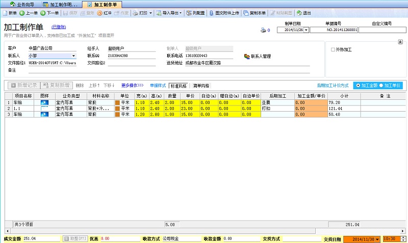 (1)在廣告公司管理系統(tǒng)中業(yè)務(wù)流程管理是十分清晰的,首先客戶下單后,就在軟件中開出加工制作單,把客戶的加工制作要求都填寫完整。(注:軟件是可以直接拖入圖片,軟件自動(dòng)識(shí)別尺寸,進(jìn)行快速開單)