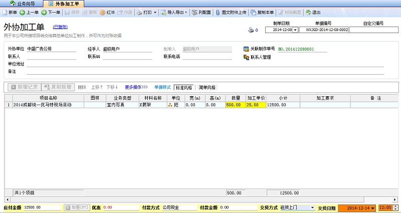 (2)在加工制作單完成以后,就把需要交給外協(xié)公司制作的外協(xié)單開好,其中加工單價(jià)是可以給句外協(xié)單位給出的報(bào)價(jià)填寫,或者是直接填寫總價(jià)格。如下圖所示: