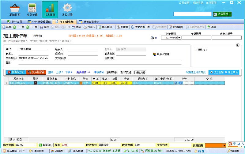 對于農(nóng)先生他們公司需要的開單方式,在飛揚(yáng)動力廣告公司管理軟件中是很輕松就能完成的,例如他們的客戶把需要制作的圖片發(fā)給他們后,要采用1.2MM厚板進(jìn)行加工,材料單價是60元/平米,客戶要做1張,寬3M高1M的厚板,后期加工這張板要20個沖孔,一個沖孔的單價是5元/個,那么在軟件中開單就應(yīng)該如下圖所示,前面的材料計價就是寬*高*數(shù)量*單價=180元,而后期加工是按照加工金額來算,就是直接算所有的沖孔的總價格是20*5=100元,總價格就是180+100=280元。