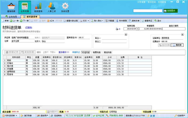 在廣告公司管理系統(tǒng)中,需要用戶對(duì)自己公司的倉(cāng)庫(kù)的庫(kù)存量進(jìn)行入庫(kù)出庫(kù)管理,入庫(kù)的主要方式當(dāng)然就是通過材料進(jìn)貨入庫(kù),用戶需要開出材料進(jìn)貨單,記錄本次采購(gòu)的材料是哪一些,采購(gòu)單價(jià)、采購(gòu)數(shù)量等信息,以及能夠把本次運(yùn)費(fèi)等費(fèi)用算到成本中去,平攤到每一個(gè)產(chǎn)品的采購(gòu)單價(jià)中。如下圖所示: