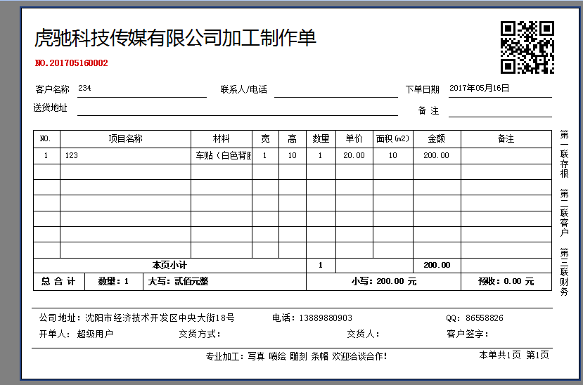 飛揚動力廣告公司管理軟件可以客戶自己的需求,設計不同的打印樣式。飛揚動力廣告公司管理軟件可以將客戶的公司logo、二維碼等等直接放在打印的樣式中。這樣在打印的時候就可以帶出來。方便增加公司的形象。