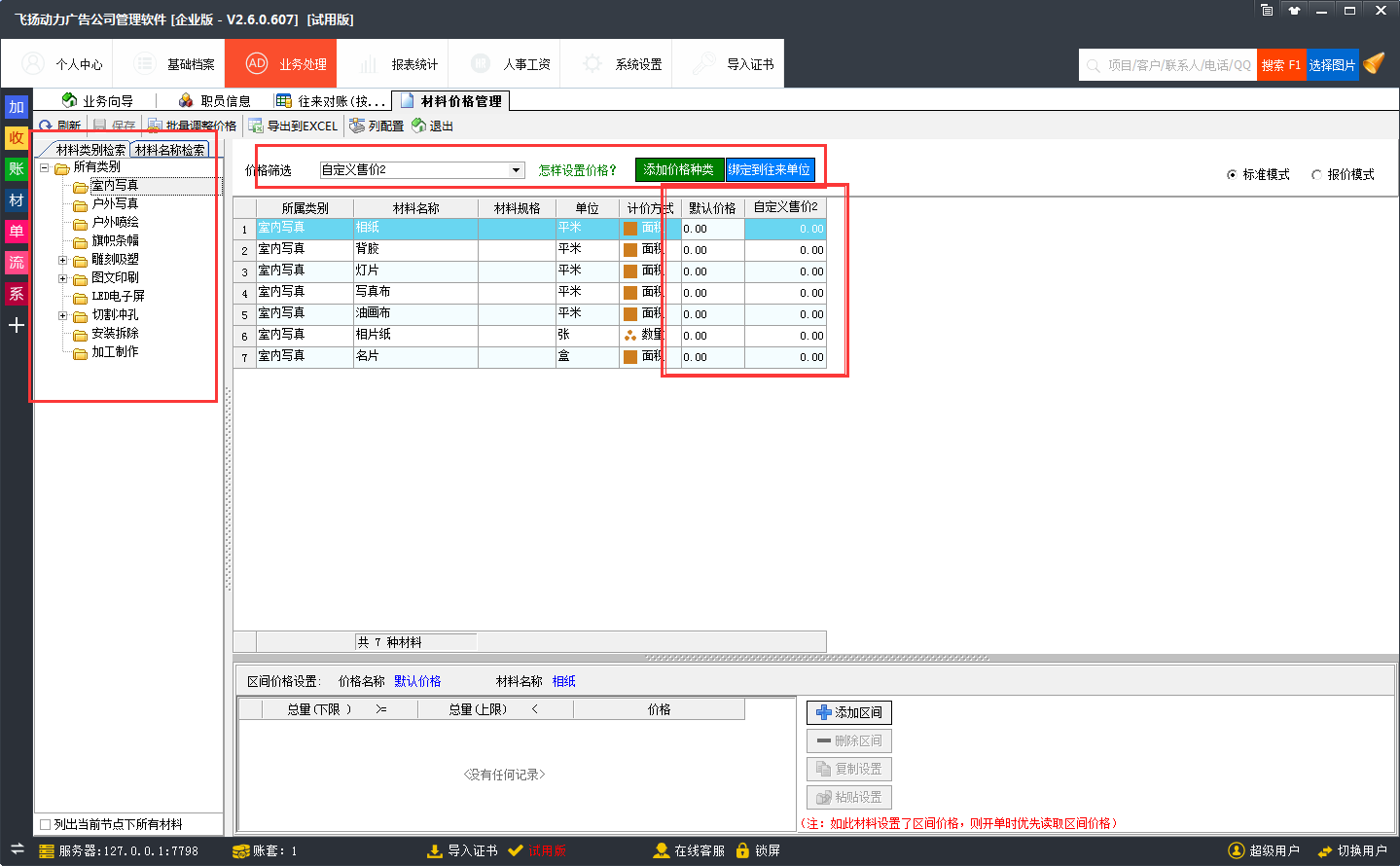 飛揚動力廣告公司管理軟件可以針對不同的客戶設(shè)置不同的價格,比如,針對臨時客戶設(shè)置一套獨立的價格,只需要到材料價格管理中,添加一個臨時客戶的分類。然后,填寫對應(yīng)的臨時客戶的材料價格就可以了。
