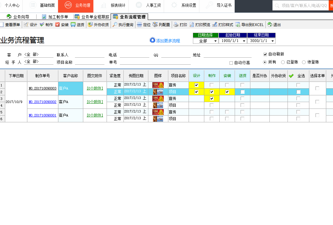 飛揚動力廣告公司管理軟件中針對廣告公司實際整個業(yè)務的公司內(nèi)部流程做了規(guī)范的管理方案。業(yè)務單需要的流程,流程是否完成等狀態(tài)可以非常直觀的體現(xiàn)出來,需要查詢業(yè)務單進度各員工也可以直接查詢,大大優(yōu)化了各部門之間的銜接過程,這樣不僅提高了公司效率,更是使得公司管理更加科學化規(guī)范化。