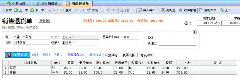廣告公司在材料銷售過程中,如果遇到客戶需要退貨的時(shí),就應(yīng)該考慮把客戶退回的材料退回到那個(gè)倉(cāng)庫(kù),具體有哪些材料名稱,退回的數(shù)量,計(jì)價(jià)單位,退貨單價(jià)是多少等等,公司就應(yīng)該要有一套良好的退貨管理機(jī)制來處理這種情況。在飛揚(yáng)動(dòng)力廣告公司管理軟件企業(yè)版中,就可以讓廣告公司用戶使用銷售退貨單來管理整個(gè)退貨程序。