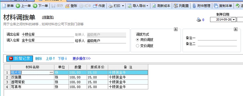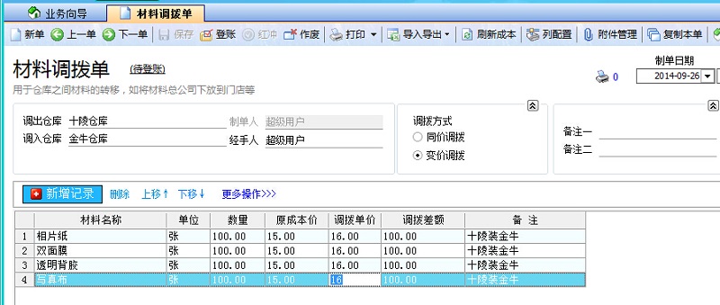 第三、在材料調(diào)撥單明細(xì)中,選擇需要調(diào)撥的材料名稱,填寫調(diào)撥數(shù)量,原成本價(jià),如果是變價(jià)調(diào)撥還需要填寫調(diào)撥單價(jià),備注等信息。
