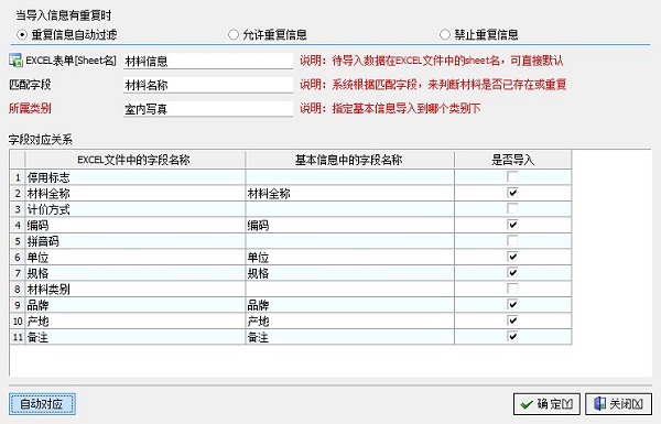 材料信息是可以按照Excel格式進行導入導出的,而導出的格式是和材料信息管理界面中顯示的結(jié)果的格式一樣;而導入是需要選擇導出的材料信息Excel表,并且可以選擇需要對應的字段,如圖3所示;