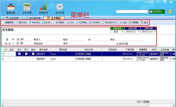在業(yè)務跟蹤的菜單欄中主要有一下幾項功能:1.查看原單;2.圖文設計;3.制作完工;4.送貨;5.執(zhí)行查詢;6.打??;7.打印預覽;8.打印設置;9.導出到Excel;10.定位;11.列配置;12.退出;