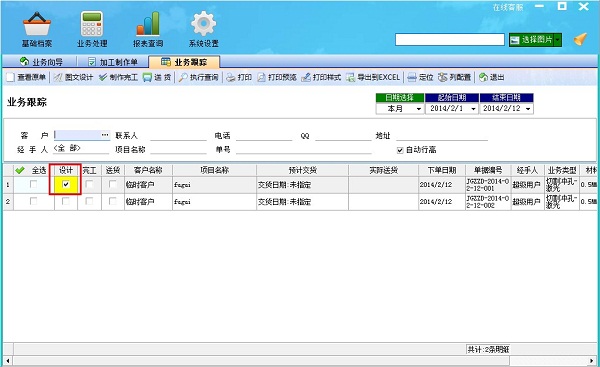 如果訂單只是開好,但是還沒有進行設計,那么就讓設計部門的設計人員把訂單中的項目設計完成,完成后就在業(yè)務跟蹤菜單欄點擊“圖文設計”,填寫好信息后點擊確定,在業(yè)務跟蹤界面列表信息中的“設計”一欄就會顯示為黃色背景并勾選,如圖2所示