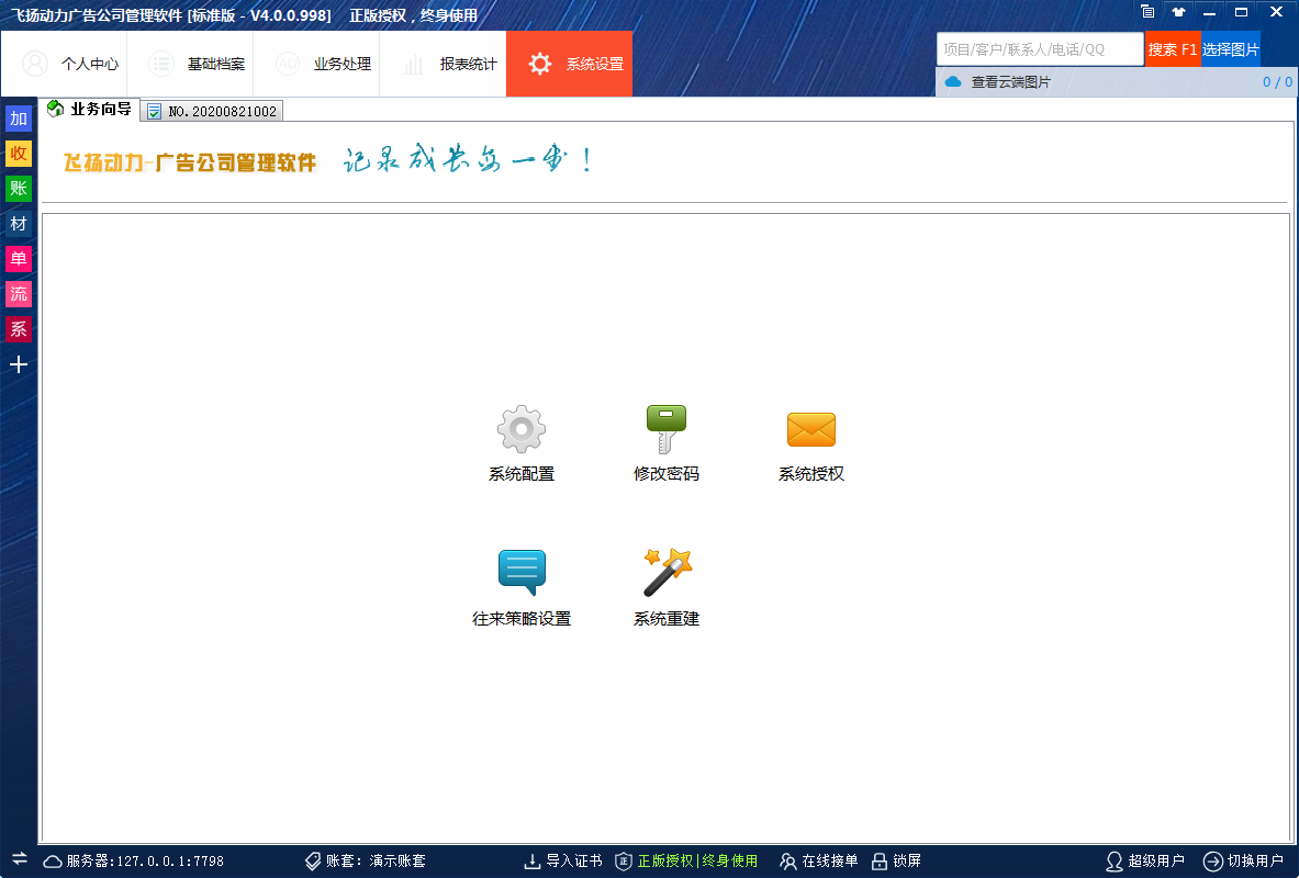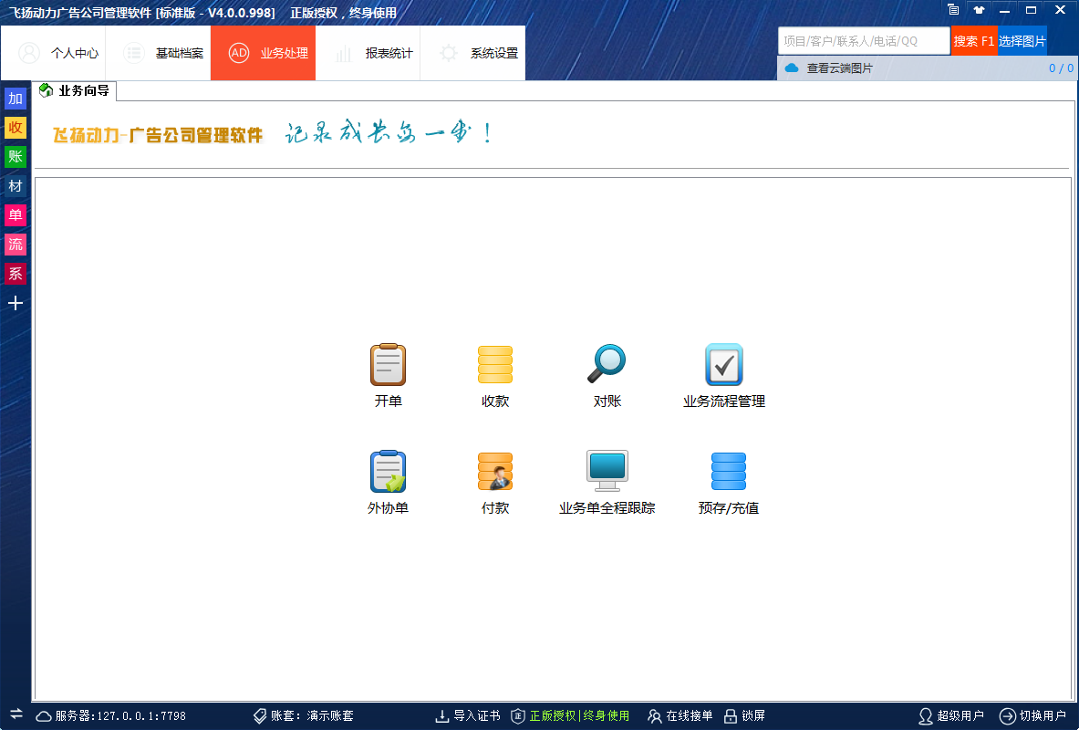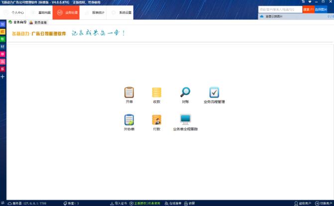 飛揚動力廣告公司管理軟件標準版適合中型廣告制作企業(yè),集業(yè)務(wù)開單、外協(xié)加工管理、業(yè)務(wù)流程管理、客戶管理、材料管理、往來策略(不同的客戶不同的價格)、業(yè)務(wù)單打印等多項功能為一體,是企業(yè)數(shù)字化轉(zhuǎn)型首選。