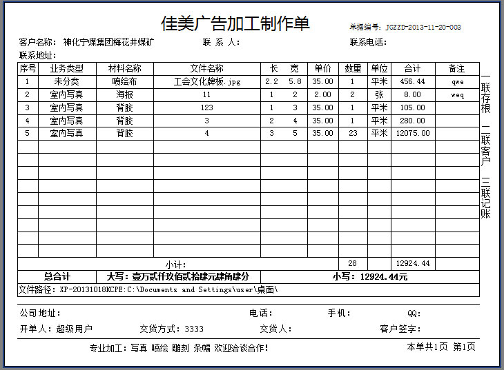 與日常使用的訂單完全吻合,適用于廣告制作各細(xì)分行業(yè),制單簡潔快速,直接拖拽圖片即可完成一筆業(yè)務(wù)錄入,并且自動分析圖片尺寸、用料、價格跟蹤及自動計算小計等,所有操作僅需一步拖拽動作。